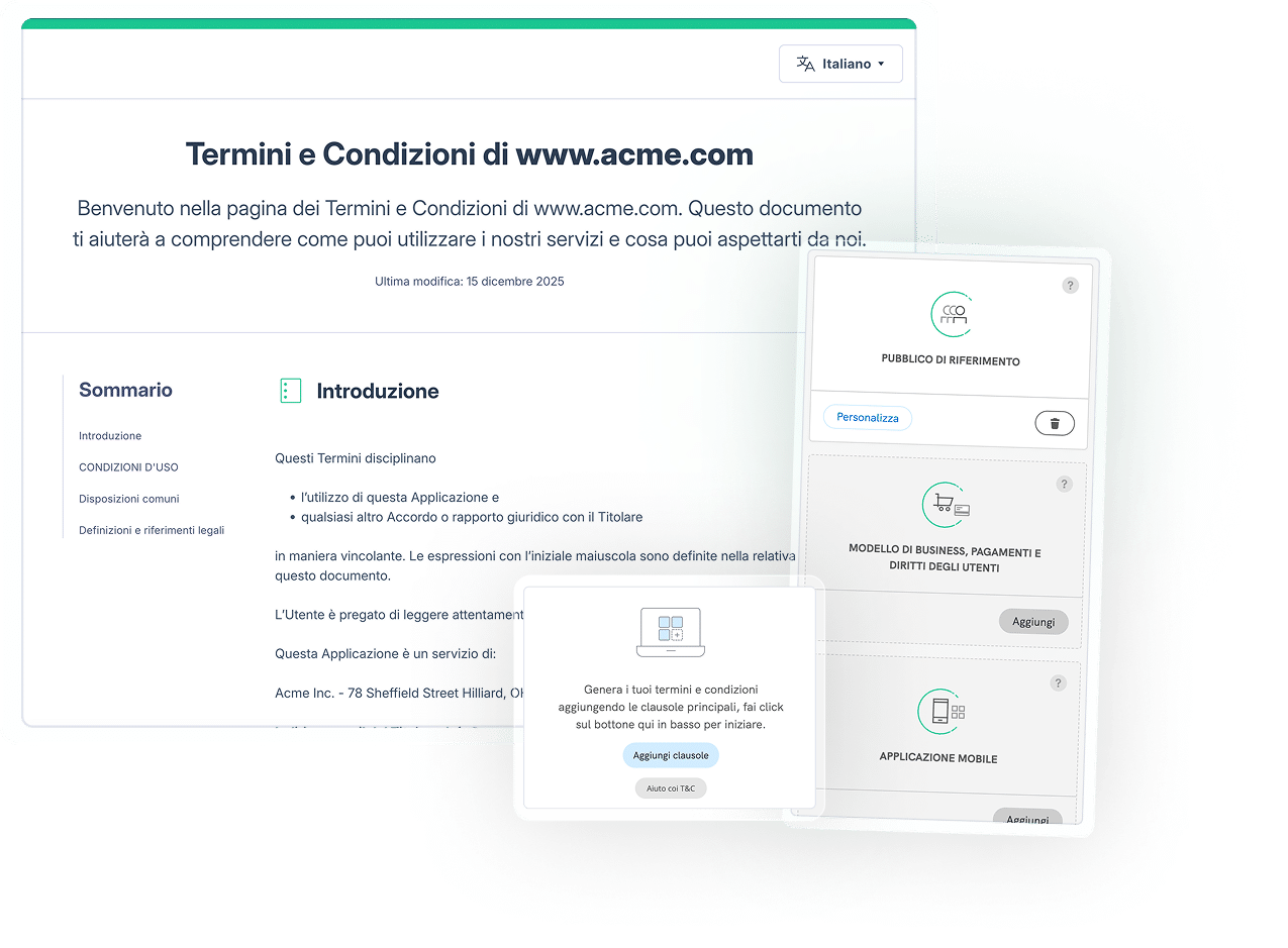 Genera termini e condizioni su misura, sempre aggiornati e progettati per accompagnare la crescita del tuo business.