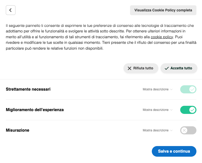 Puoi registrare e gestire facilmente la prova delle preferenze di consenso degli utenti in un solo clic.