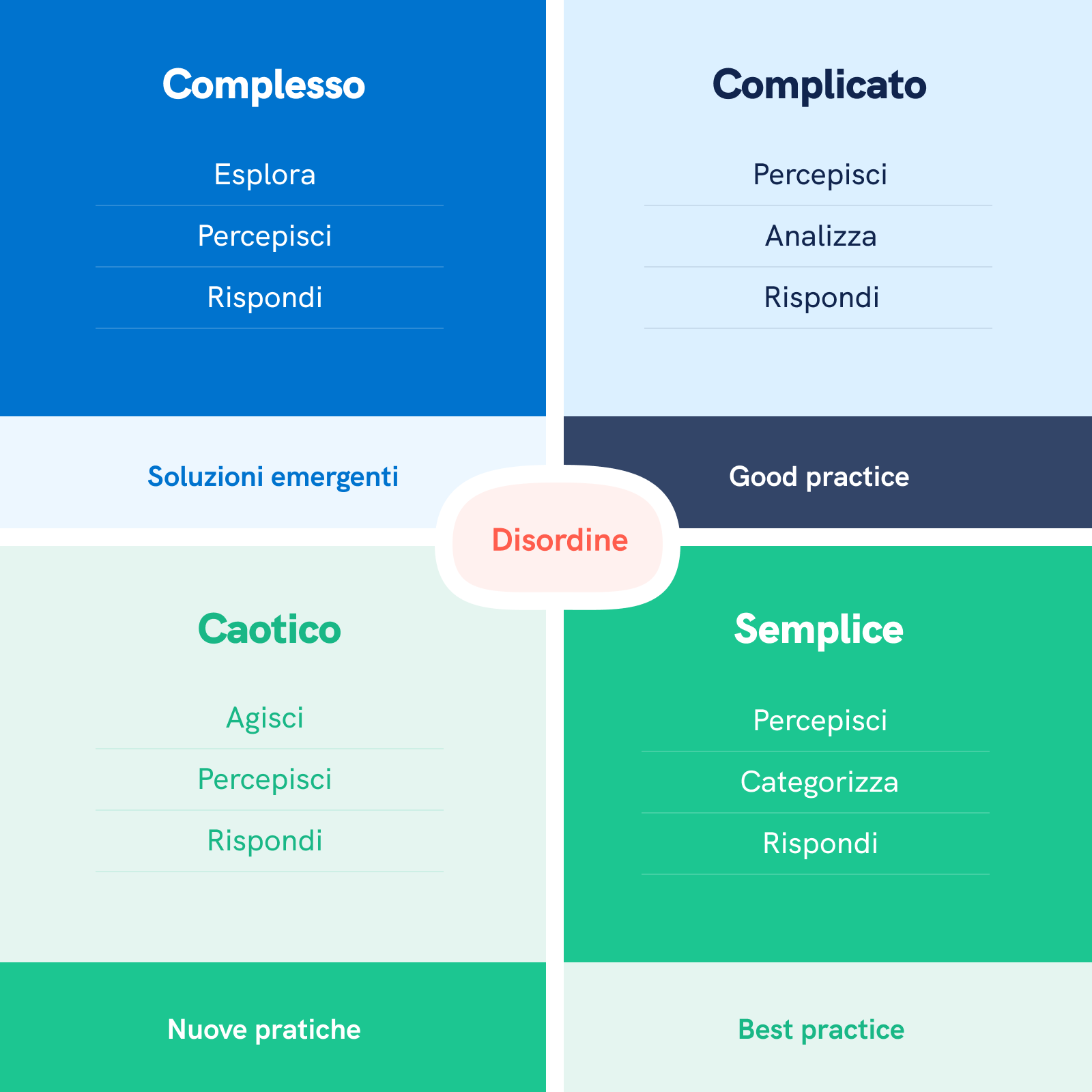 - Caotico: di solito associato alla gestione di emergenze, bisogna agire immediatamente per prevenire una crisi e ragionare in retrospettiva, poiché non c’è tempo per sperimentare.