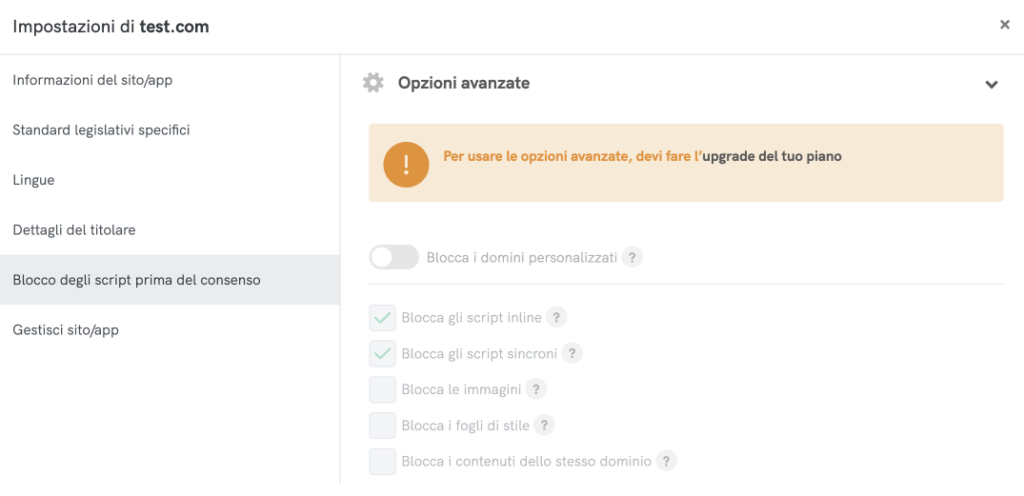 - Blocca gli script inline: Quando questa opzione è abilitata, gli script direttamente integrati nell’HTML del tuo sito web verranno bloccati prima del consenso