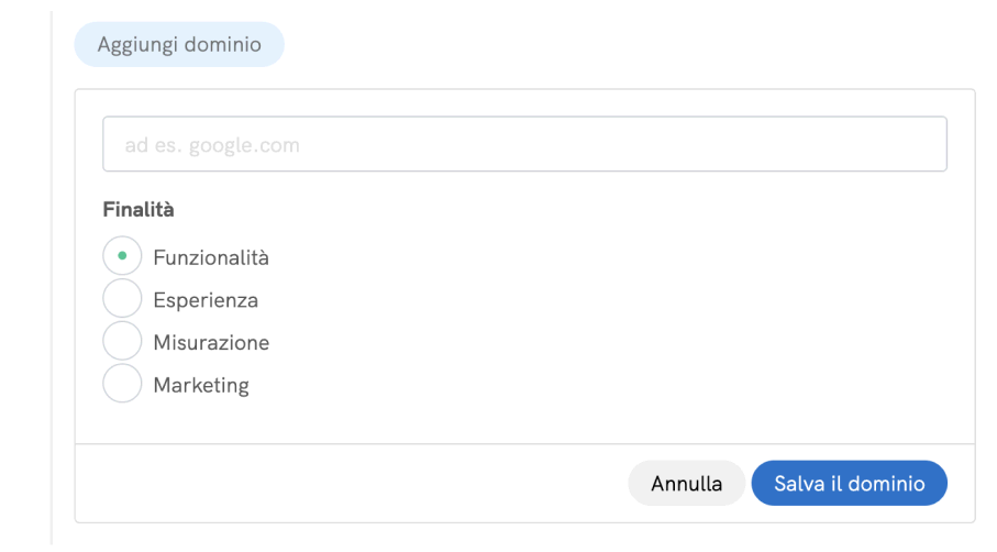 Puoi aggiungere manualmente un dominio che potrebbe contenere uno script che installa cookie o strumenti di tracciamento se questo dominio non è stato rilevato dal nostro sistema. In questo modo, le richieste provenienti da quel dominio saranno limitate fino a quando non verrà prestato il consenso per la specifica finalità indicata.
