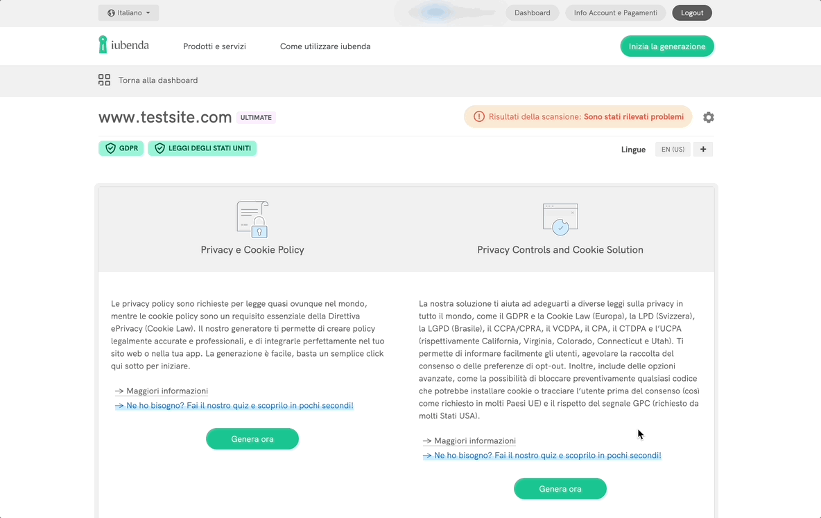 Clicca su “Attiva” dalla Dashboard di iubenda.