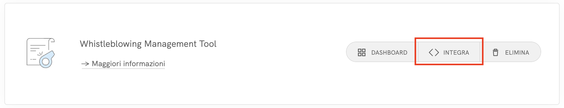 ⚠️ Una volta attivato il Whistleblowing Management Tool, assicurati di cliccare sul pulsante “Integra” all’interno del riquadro Whistleblowing per procedere con l’integrazione del modulo. In caso contrario, non sarà possibile ricevere alcuna segnalazione. Scopri di seguito come integrare il Whistleblowing Management Tool ⬇️