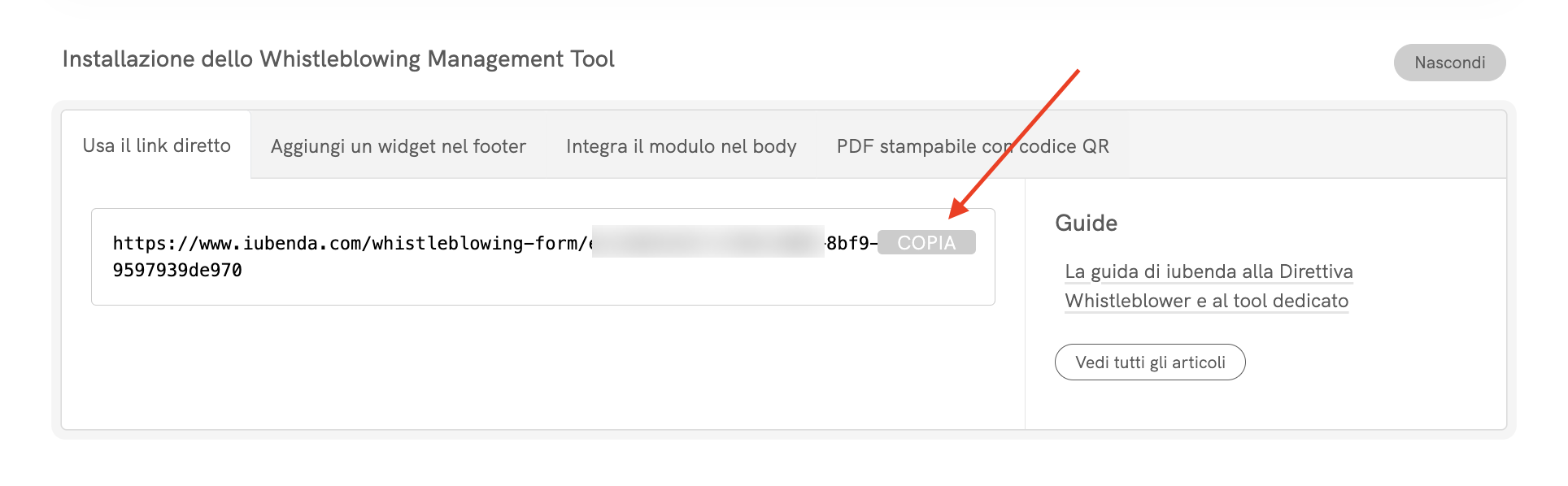 Dopo l’attivazione, clicca su “Integra” per integrare il modulo di segnalazione in modo da facilitarne l’accesso da parte dei dipendenti o di altri potenziali whistleblower.