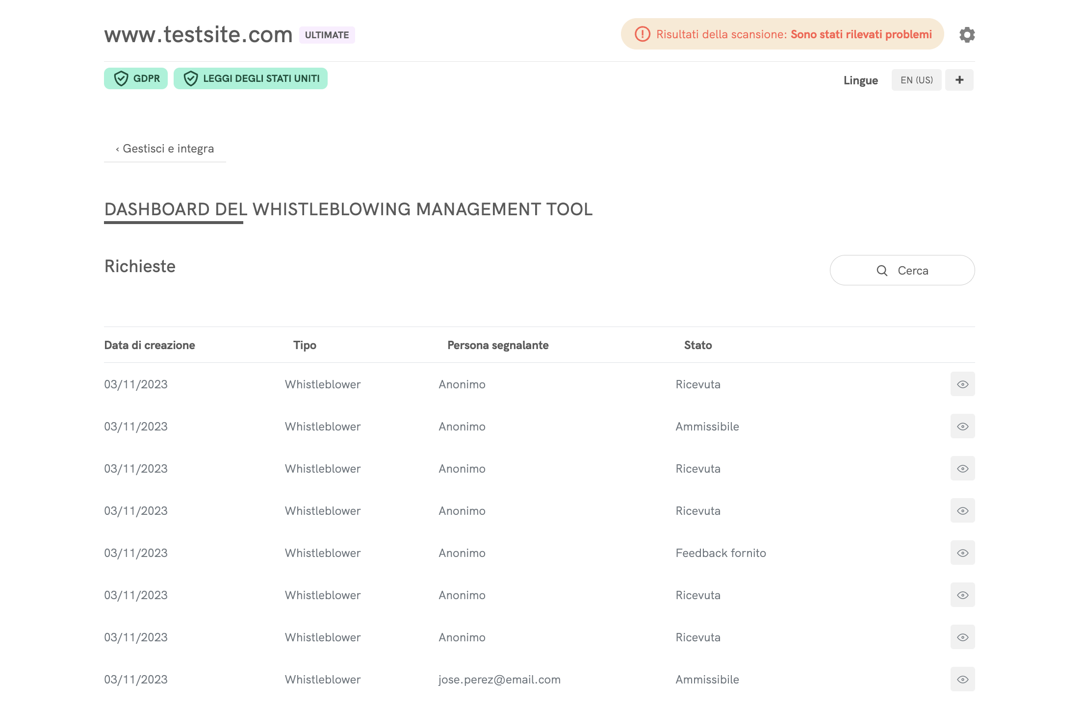 La Dashboard Whistleblowing permette di accedere a tutte le richieste e alle informazioni correlate, quali la data di creazione, il tipo di richiesta, la persona segnalante e lo stato, insieme all’icona dei dettagli.