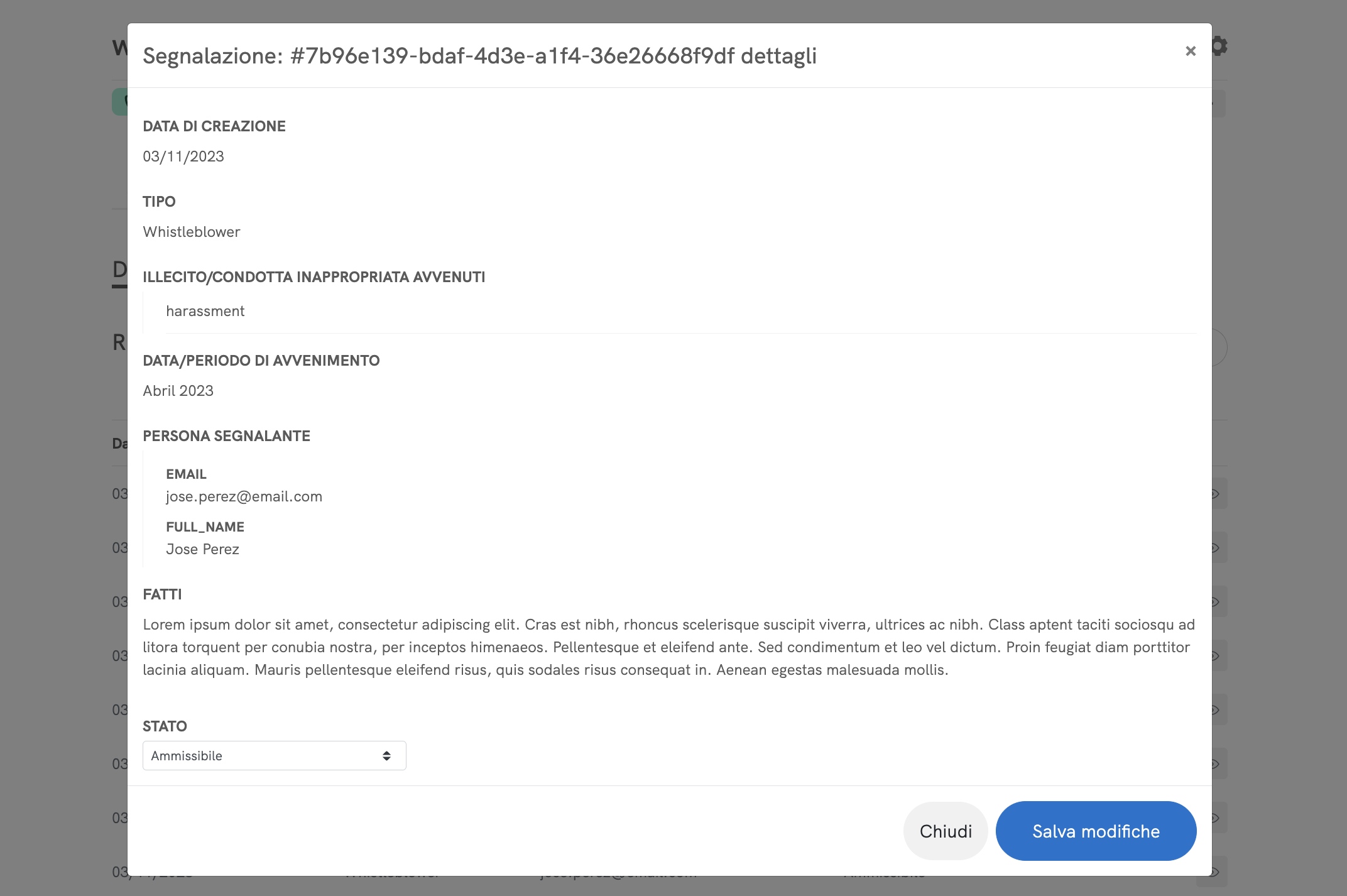 Facendo clic su una segnalazione, tutti i dettagli della segnalazione diventano visibili. Ciò ti consentirà di prendere subito in carico qualsiasi problema segnalato, garantendo al contempo un canale sicuro e riservato per i whistleblower.