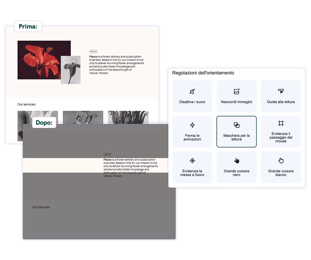 Per molti utenti, le animazioni e i suoni dei siti web possono risultare fastidiosi. I nostri strumenti di orientamento permettono ai visitatori di silenziare i suoni, nascondere le immagini, utilizzare guide di lettura e fermare le animazioni, creando un’esperienza di navigazione focalizzata che supporta le persone con ADHD, autismo o epilessia.