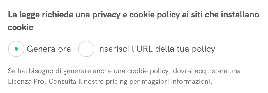 La prima opzione (“Genera ora”) consente di generare una policy che estrae automaticamente i dati rilevanti dalla tua privacy policy iubenda e si aggiorna automaticamente quando aggiungi nuovi servizi o se la legge cambia. Per iniziare fai click su “Avanti” e verrai indirizzato alla pagina di generazione, dove potrai attivare la tua cookie policy con un solo click. Questa opzione richiede una licenza Pro – se non ne hai già una, consulta la pagina dei prezzi per saperne di più. Per maggiori informazioni sulla generazione di una cookie policy ti invitiamo a leggere questo articolo.