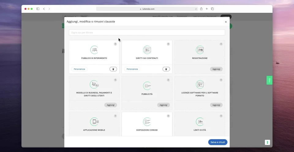 Fai click sul pulsante Applica modifiche in basso a destra per salvare le tue personalizzazioni. Questa azione ti riporterà alla finestra contenente le varie clausole. Una volta conclusa la procedura di aggiunta e personalizzazione delle clausole, fai click su Salva e chiudi.