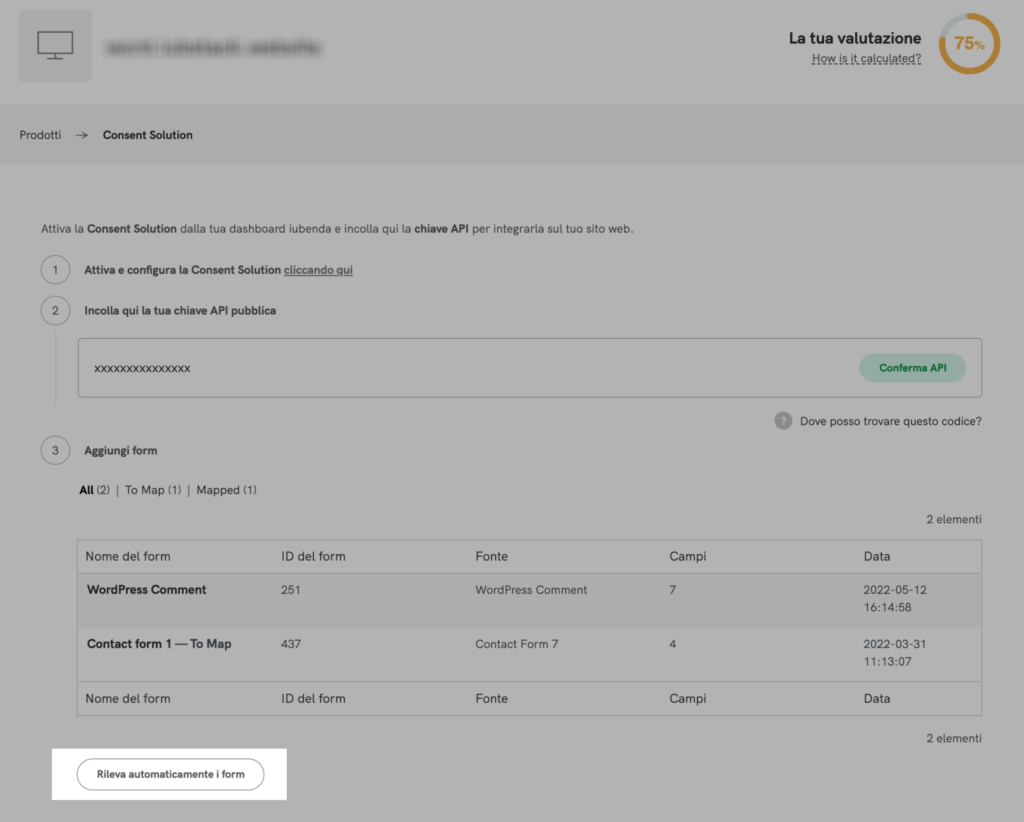 Fai click sulla scheda Consent Database e inserisci la chiave API pubblica che trovi in Dashboard > [Il tuo sito] >Consent Database > Integra.