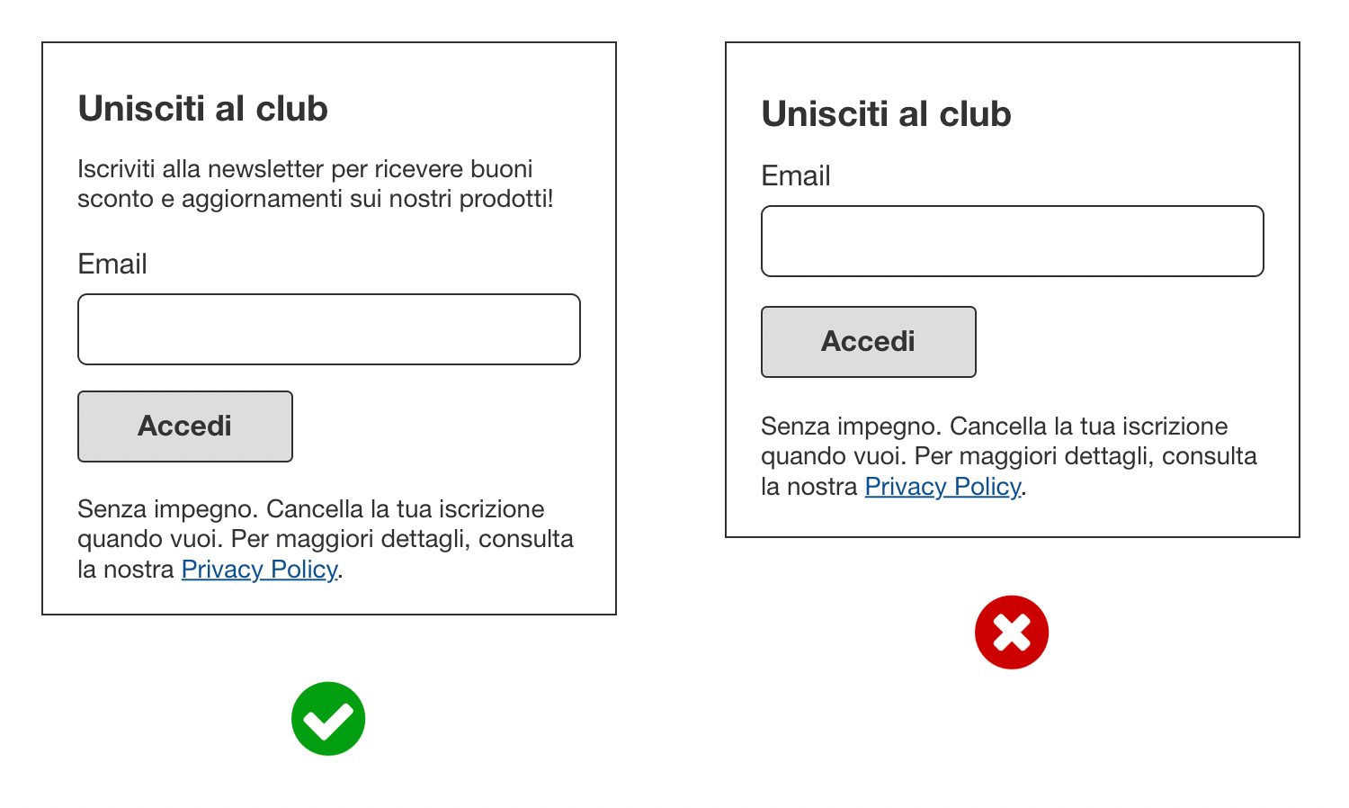 L’utente medio dovrebbe essere facilmente in grado di capire a cosa sta acconsentendo (ad esempio che tipo di email riceverà, se riguarderanno prodotti e servizi propri o di terzi etc.). -