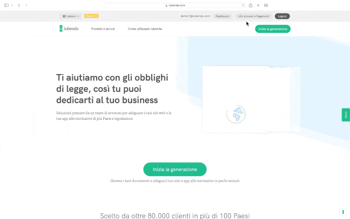 - Poi clicca sul tasto “Info Account e Pagamento” nel menù a tendina in alto a destra per accedere alla pagina del tuo account iubenda.