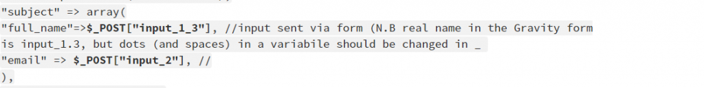 "full_name"=>$_POST["input_1_3"], //input sent via form (Please note: real name in the Gravity Forms is input_1.3, but dots (and spaces) in a variabile should be changed in _