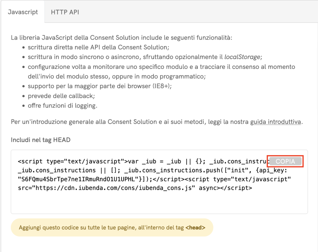 Clicca sul pulsante COPIA accanto al codice. Quando il pulsante diventa verde, significa che è stato copiato.