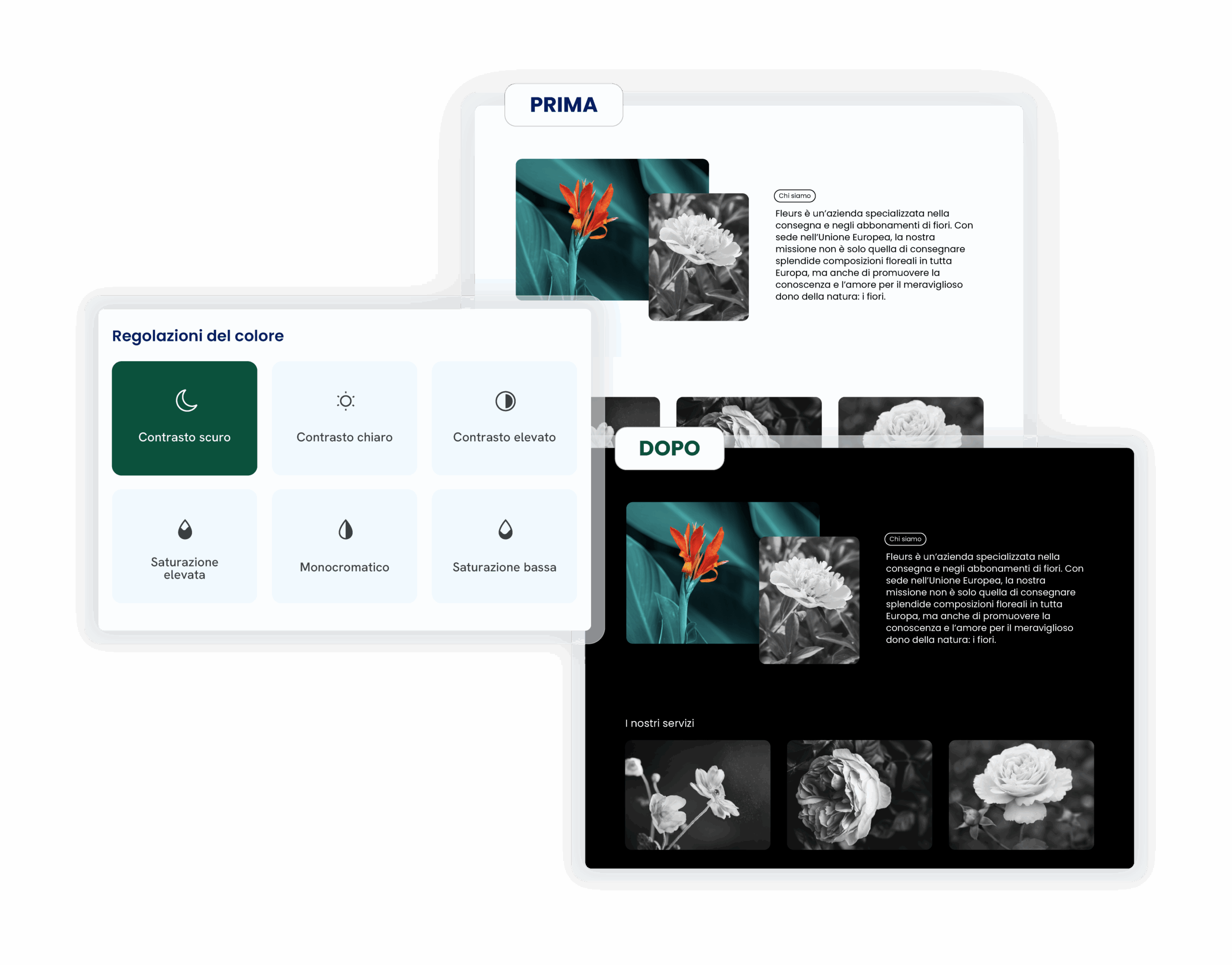 • Dark mode, contrasto alto, colori accessibili