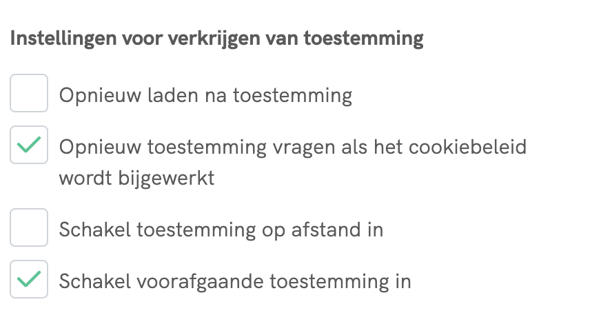 Toestemming voor cookies moet vrij, specifiek, geïnformeerd en ondubbelzinnig zijn, en moet worden gegeven door middel van een duidelijke actieve handeling (een opt-in). Als je dus selectievakjes gebruikt, mogen die niet vooraf zijn aangevinkt.