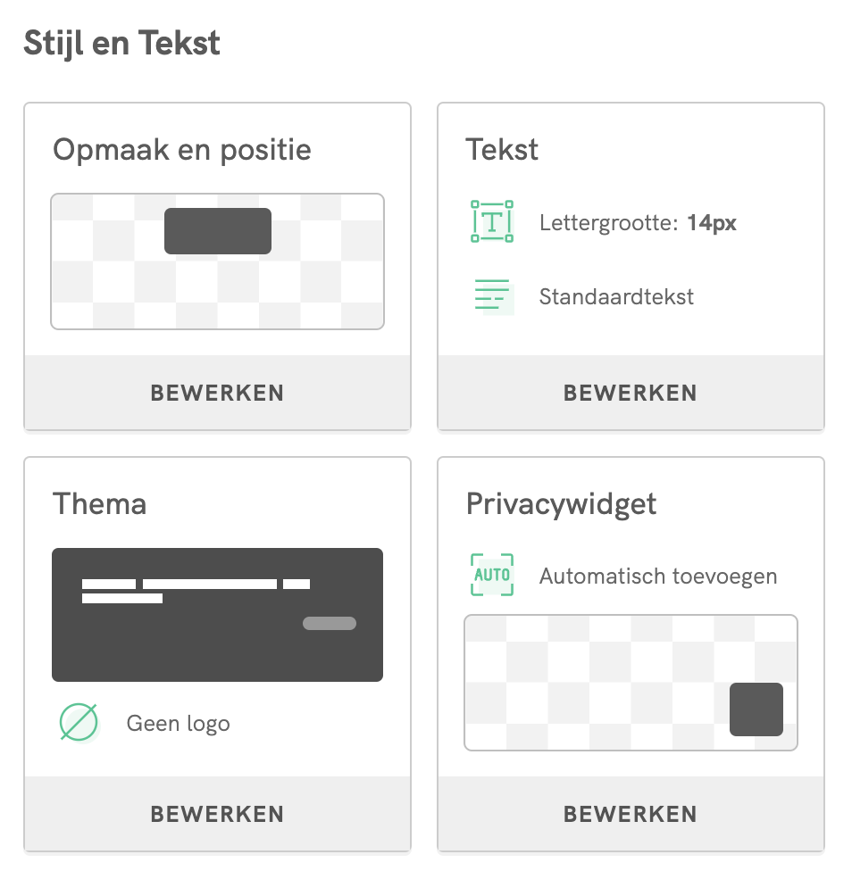 • De locatie en het uiterlijk van je cookiemelding aanpassen, bijvoorbeeld door de kleuren van de banner aan te passen aan je website, je logo toe te voegen en je eigen branding te creëren.