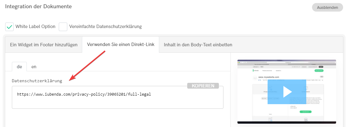 Die Datenschutzerklärung von iubenda bietet zwei weitere Integrationsoptionen: