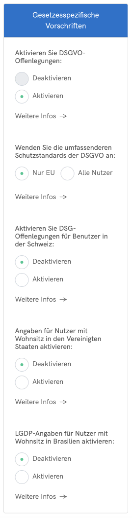 ❓ Was kann ich tun, wenn ich andere Gesetze einhalten muss, die eine vorherige Einwilligung/Opt-in-Ansatz für die Verwendung von Cookies und ähnlichen Technologien vorschreiben, wie z.B. die DSGVO und LGPD?