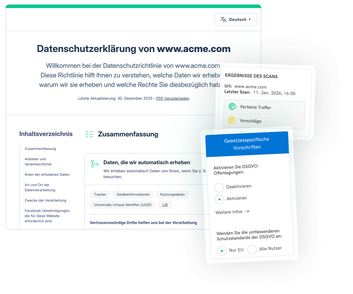 App-Store-Zulassungen, Datenschutzbestimmungen und Einwilligungsanforderungen ändern sich ständig. Holen Sie sich von Anwälten verfasste Richtlinien, native Einwilligungsprozesse und automatische Aktualisierungen, die Ihre nächste Wachstumsphase unterstützen.