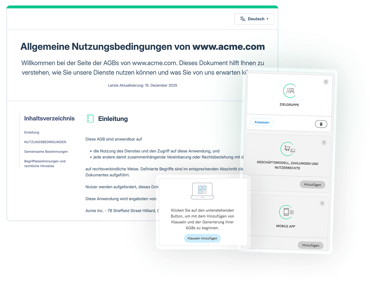 Deckt Zahlungsbedingungen, Rechte, Stornierungen und Haftungsgrenzen ab. Schützt Sie und legte klare Erwartungen für Ihre Nutzer fest.