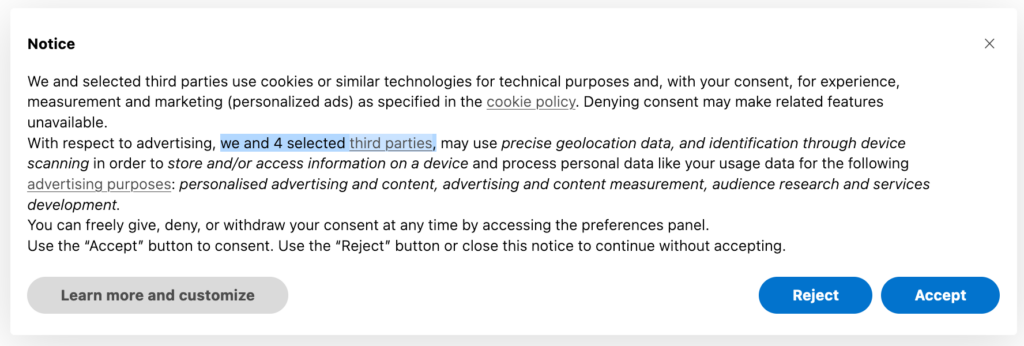 - A call to action for the user to express their consent (for example “Accept”, “Okay”, “Approve”, etc.) and one to customise their choices (for example “Advanced Settings”, “Customise Choices”, etc.)