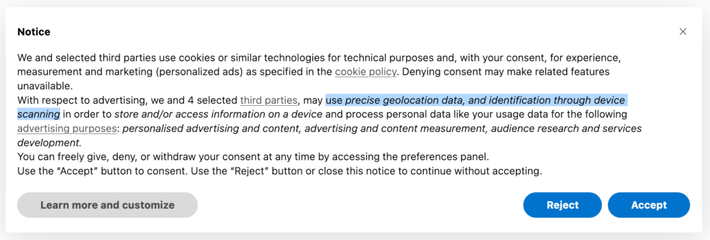 - Information about the fact that information is stored on and/or accessed from the user’s device (e.g. use of cookies, device identifiers, or other device data)