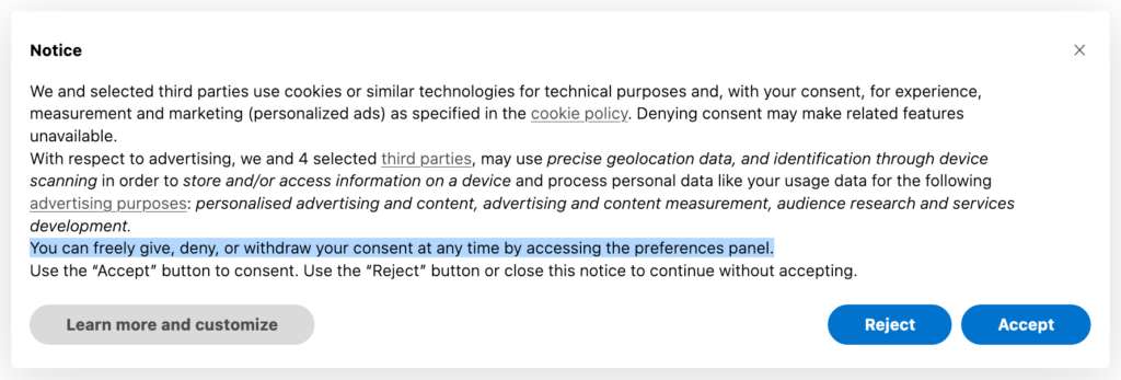 - Information about the fact that the user can withdraw their consent at any time, and how to resurface the Framework UI in order to do so
