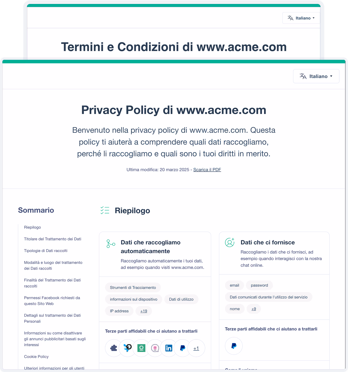 Genera e gestisci facilmente Termini e Condizioni professionali. Ottimizzato per e-commerce, marketplace, Saas, app e altro ancora.