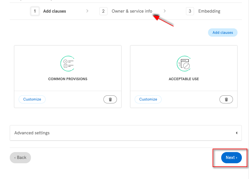 The final step is to integrate the terms you’ve just generated with your website/ app. This is done by using the embedding code, or link provided on the “embed” page.