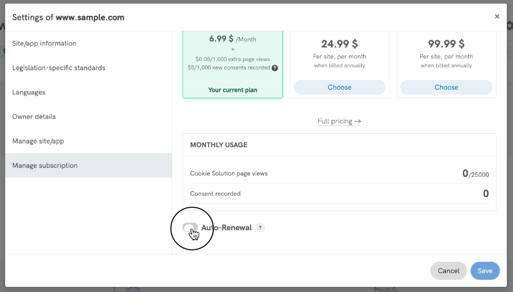 Your iubenda subscription is usually set to renew on a monthly/yearly basis via our auto-renewal feature.