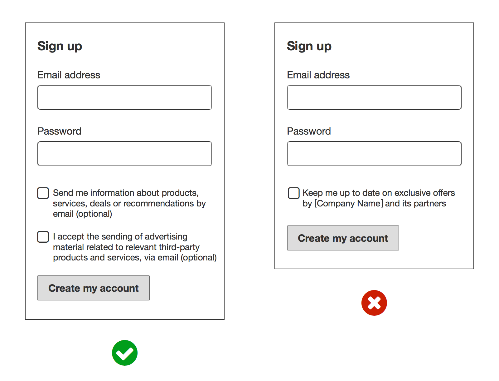 Let’s take the GDPR as a reference. As we said, the GDPR uses an opt-in approach, and – when consent is needed – it must be “freely given, specific, informed and unambiguous”. That’s why the regulation specifically forbids pre-ticked boxes and similar opt-out mechanisms.