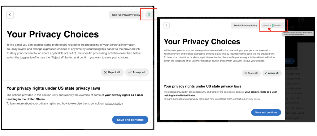 However, it will show our green logo on the top right of the second layer or preference panel (“Learn more and customize” button). When hovered over, it will display “Powered by iubenda”, and when clicked, takes the user to our homepage. See below.