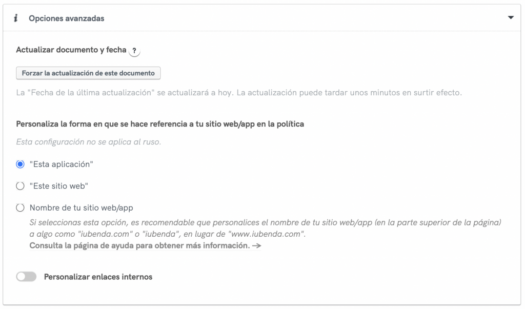 Puedes acceder a estas opciones en la sección de administración de tu política de privacidad/términos y condiciones, bajo las modificaciones de contenido, en la pestaña Ajustes avanzados.