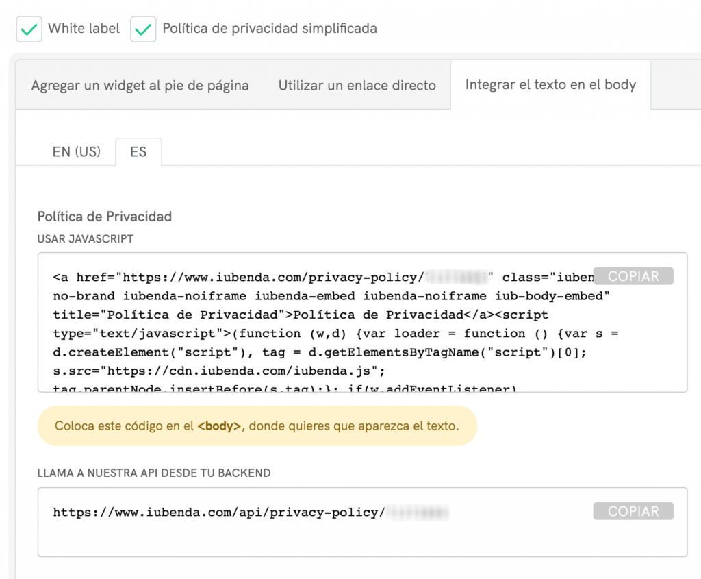 - Copia el código de iubenda de la pestaña “Integrar el texto en el body” (si aún no lo has hecho)
