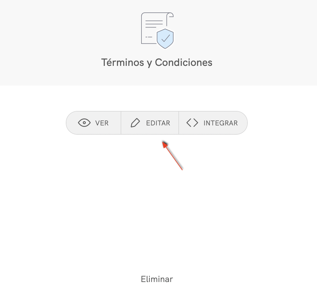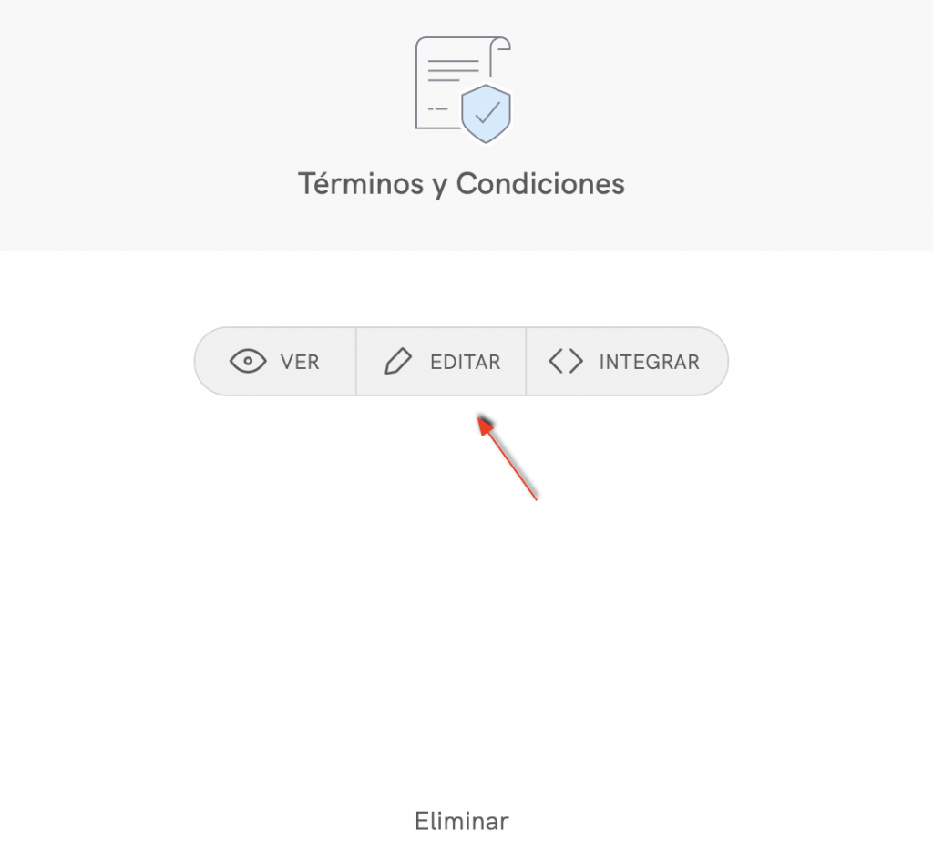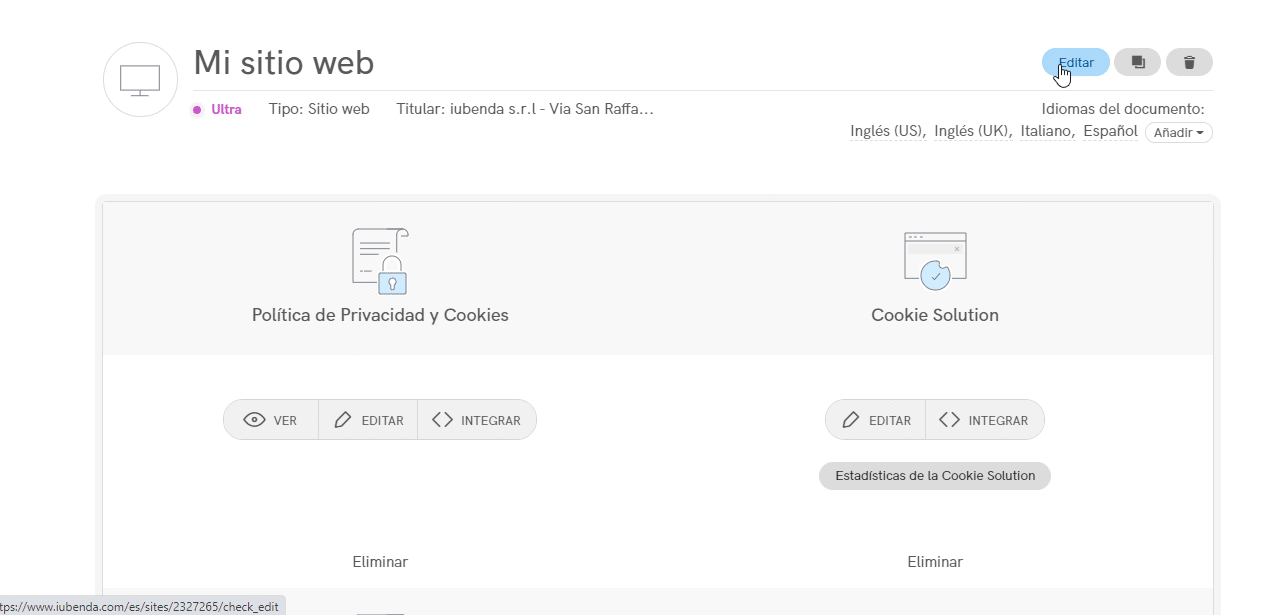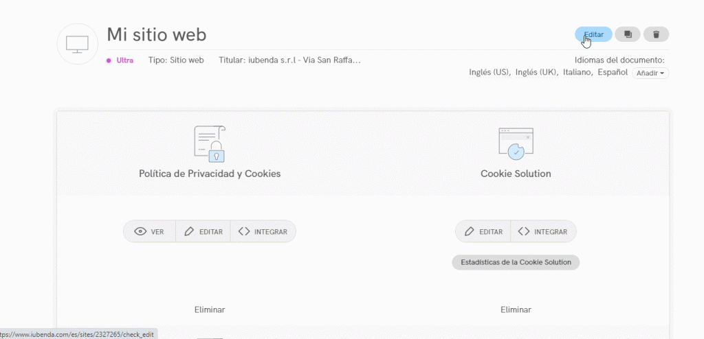 Para editar un documento, tienes que entrar en tu dashboard y seleccionar el sitio web o app del que te gustaría editar los términos y condiciones, haciendo clic sobre el mismo o en el botón Gestionar. A continuación, haz clic en el botón Editar en la sección de Términos y Condiciones.