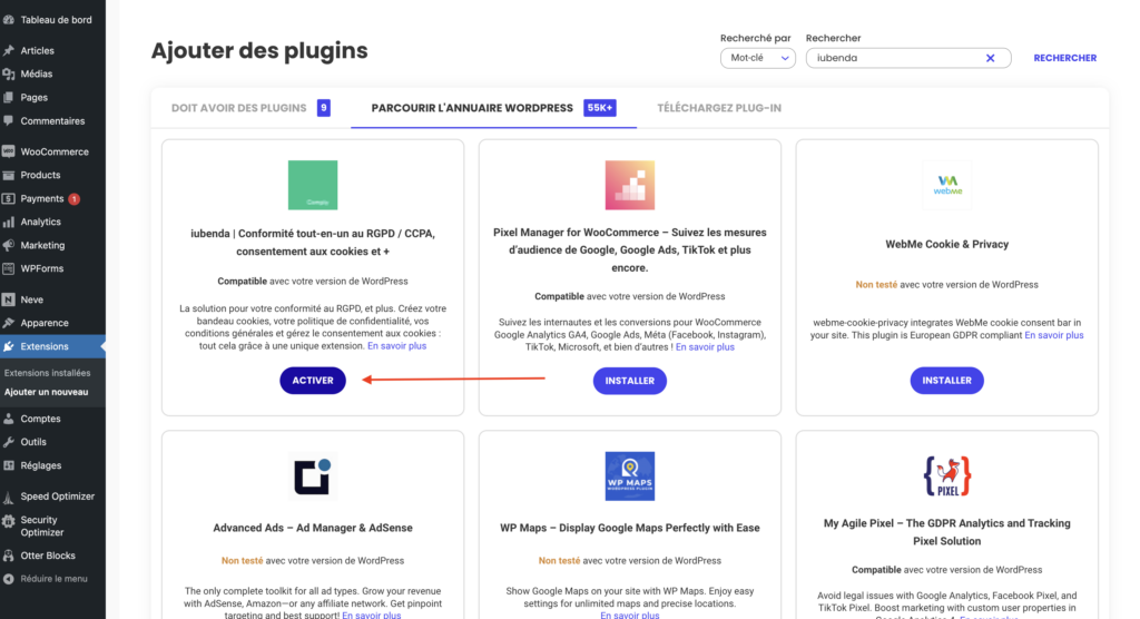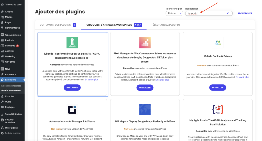 Ensuite, recherchez « iubenda » dans la barre de recherche en haut à droite. Le plugin doit apparaître en haut de la liste.