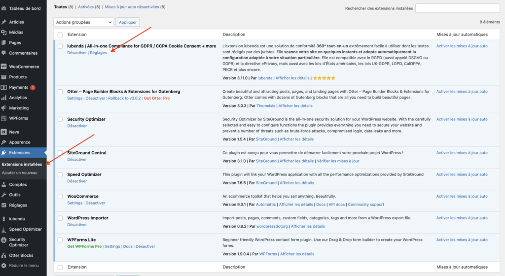 Une fois « Activé », allez dans « Extensions installés » et cliquez sur « Réglages » sous le module du plugin iubenda.