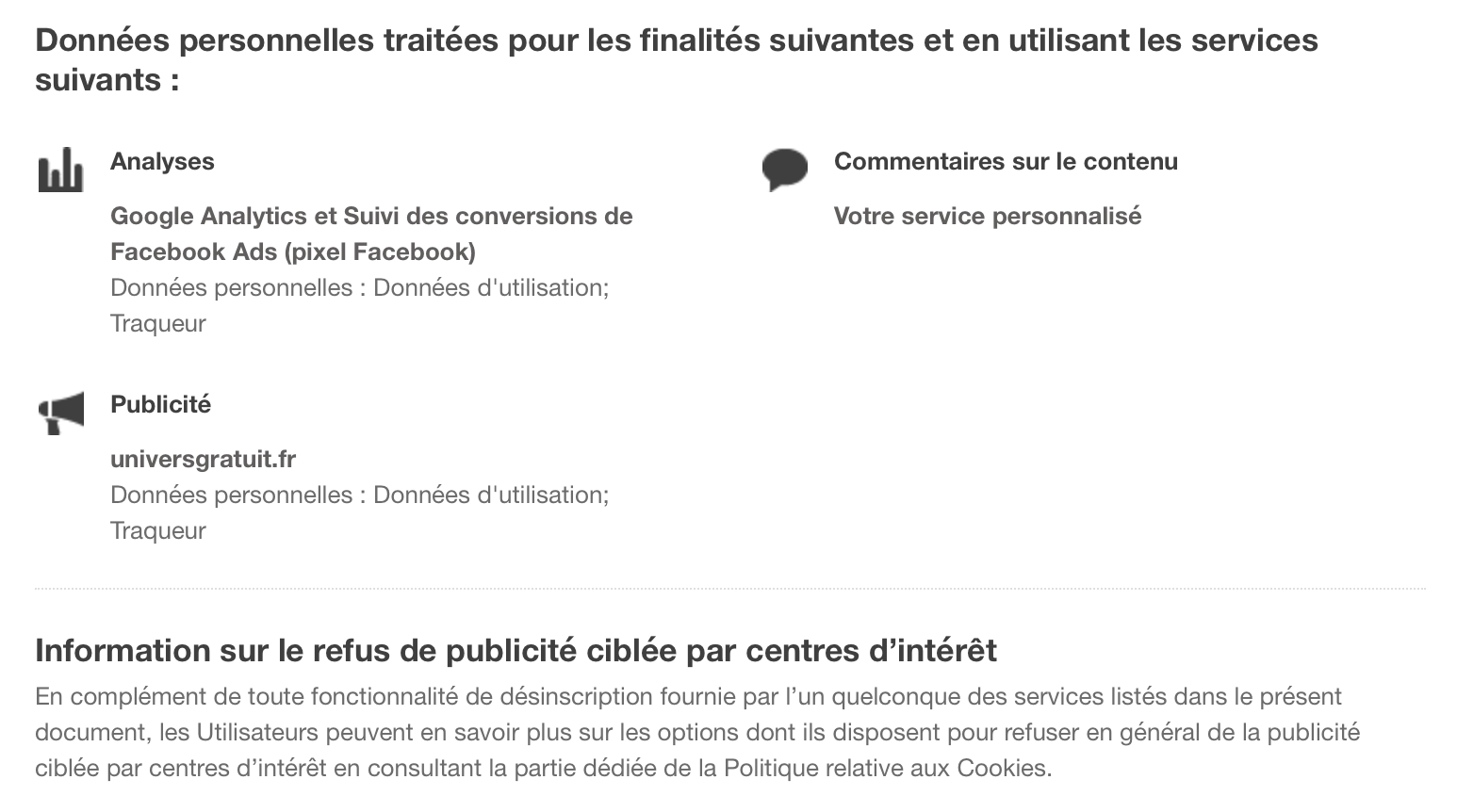 La valeur prédéfinie “Aucune finalité spécifique” s’appliquera automatiquement si aucune finalité n’a été indiquée. Si vous n’avez pas assigné de finalité particulière à votre service personnalisé, les activités de traitement de données se trouveront dans une partie à part de la politique de confidentialité appelée “Autres informations sur les Données personnelles“.