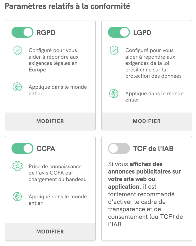 Nos configurations automatisées sont mises en place de façon à se conformer aux exigences les plus strictes en matière de législations et réglementations. Vous pouvez cependant toujours modifier chaque réglage en cliquant sur MODIFIER dans le bloc correspondant.