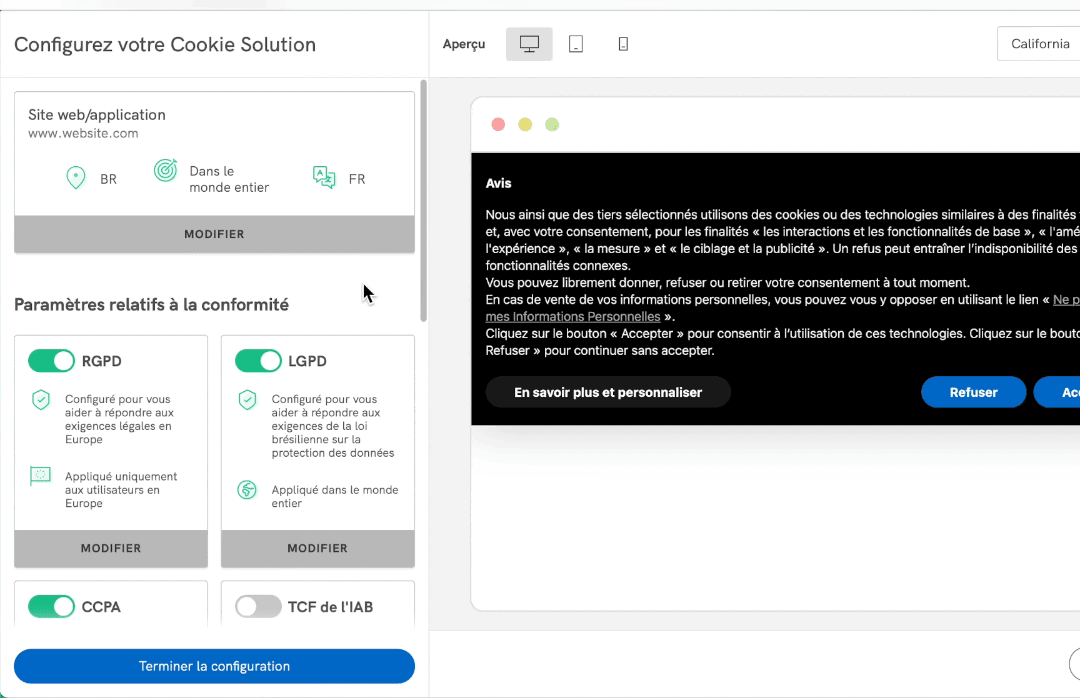 💡 Tout changement réalisé sera affiché instantanément dans l’aperçu (sur la partie droite de la page). Vous pouvez aussi passer à des aperçus différents (ordinateur, tablette, mobile), afficher le bandeau dans d’autres langues (si elles sont activées pour ce projet) ou visualiser la copie de l’avis correspondante par pays (dans le cas où un certain paramètre de conformité est appliqué seulement à un groupe d’utilisateurs en fonction du pays).