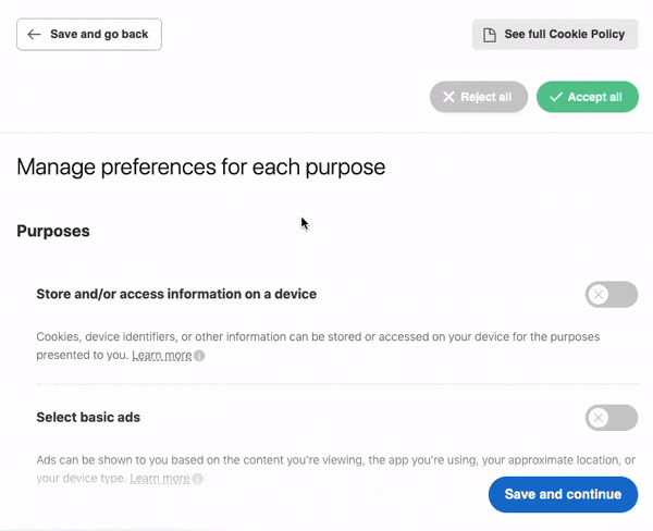 La liste de finalités a été enrichie de nouvelles options. Des catégories telles que « Sélection des publicités, affichage et rapports » ont été transformées en catégories distinctes, telles que « Sélectionner des publicités standard », « Créer un profil pour afficher des publicités personnalisées », « Sélectionner des publicités personnalisées », etc. pour vous donner d’autres occasions de recueillir le consentement. - Limitation des finalités