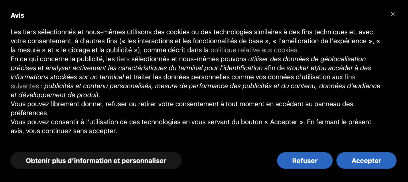 Pour respecter les critères de l’IAB applicables à la version 2, nous avons complété le texte du bandeau cookies qui est désormais beaucoup plus long. Nous y avons ajouté des informations essentielles relatives aux options améliorées que nous vous présenterons dans les sections suivantes.