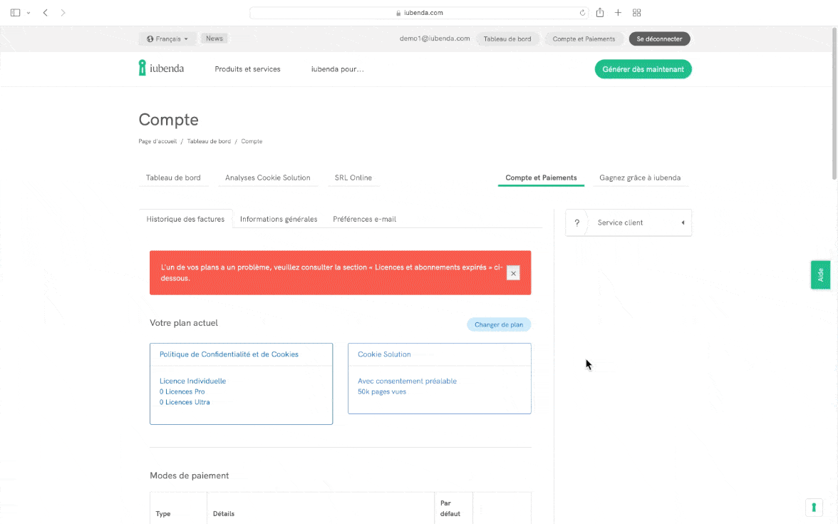 - Puis, cliquez sur le bouton « Compte et Paiements » dans le menu déroulant (en haut à droite de la page) pour accéder à votre compte iubenda.