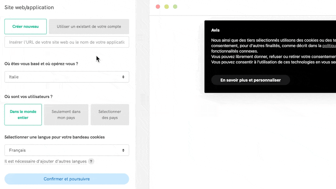 Où êtes-vous basé ? Où se trouvent vos utilisateurs ? Répondez à ces deux questions simples, et nous vous proposerons la meilleure configuration pour votre site/application. Utilisez notre configuration automatique, ou modifiez-la manuellement, selon vos préférences.
