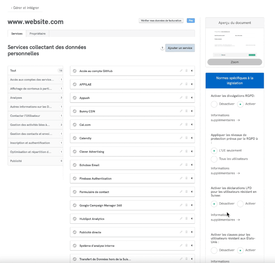 💡Avec notre Registre des activités de traitement des données, vous pouvez spécifier chaque service dans votre politique de confidentialité, qui est la base juridique du transfert de données à l’étranger selon la LPD.