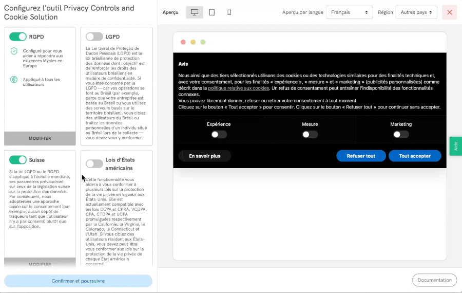 2) Une fois que vous avez terminé l’activation de votre politique de confidentialité et de cookies, assurez-vous que la vignette “Suisse” dans Privacy Controls and Cookie Solution est activée : la solution se configurera automatiquement pour vous aider à répondre aux nouvelles exigences de la LPD permettant à vos utilisateurs d’exercer leur droit d’opposition