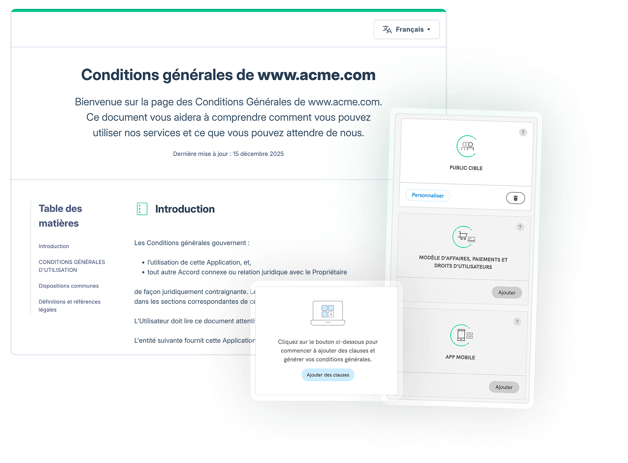 Rédigez des conditions générales professionnelles qui protègent votre application, couvrent les paiements et les droits, et s’adaptent aux règles mondiales sur la protection des consommateurs. Le tout, en 15 langues.
