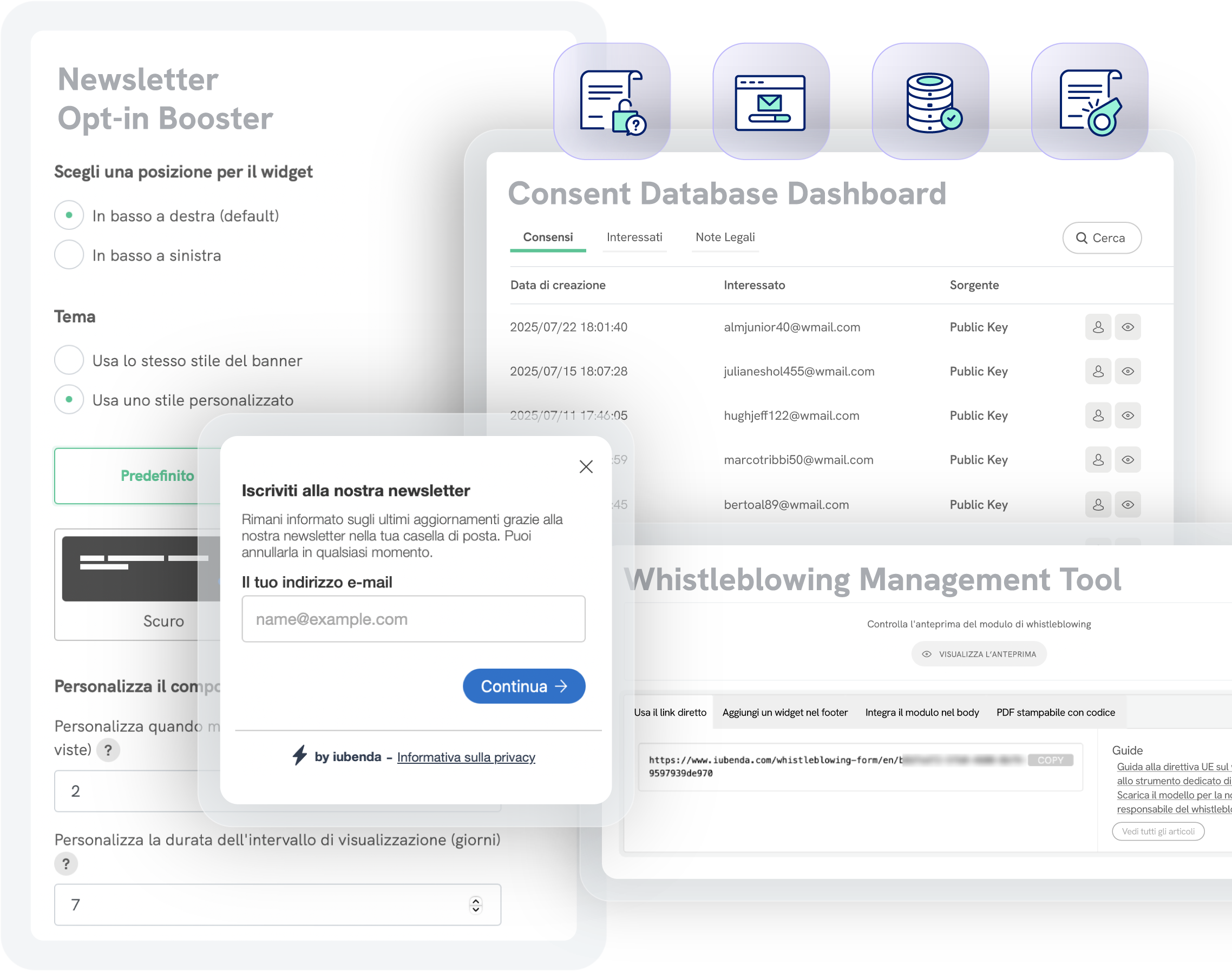 Per essere conformi servono documenti legali, gestione dei consensi e accessibilità che lavorano insieme. iubenda li riunisce in una suite che si aggiorna quando cambiano le leggi. Così ti concentri sul tuo business, non sulle normative.
