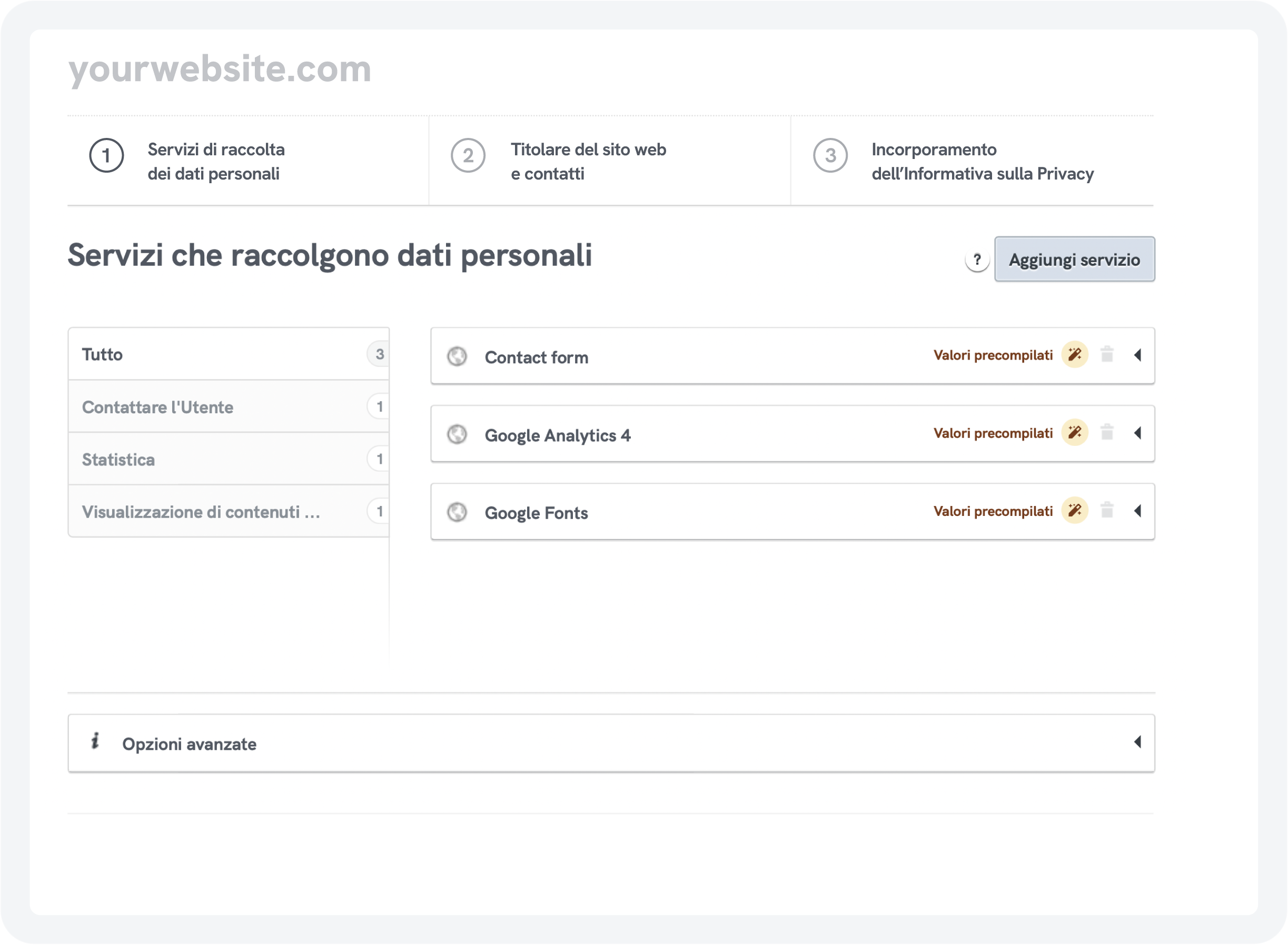 Documenti legali, cookie banner, strumenti per l’accessibilità. Tutto configurato in pochi minuti.